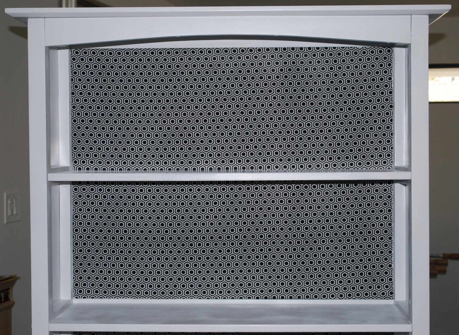 I knew when I purchased it I was going to paint it white but I wanted to add some flair to it. So I decided I was going to find some funky print and wallpaper the back of the bookcase. HOLY SMOLY!! Wallpaper is so expensive!! For the type of look I was going for the wallpaper was going to cost anywhere from $75-$100. No Way!! So I then began to brain storm and came up with the thought of finding a cool fabric and putting fabric on the back of the bookcase. I googled the idea and wah lah... (click on the pic so you can get a closer look at the print)